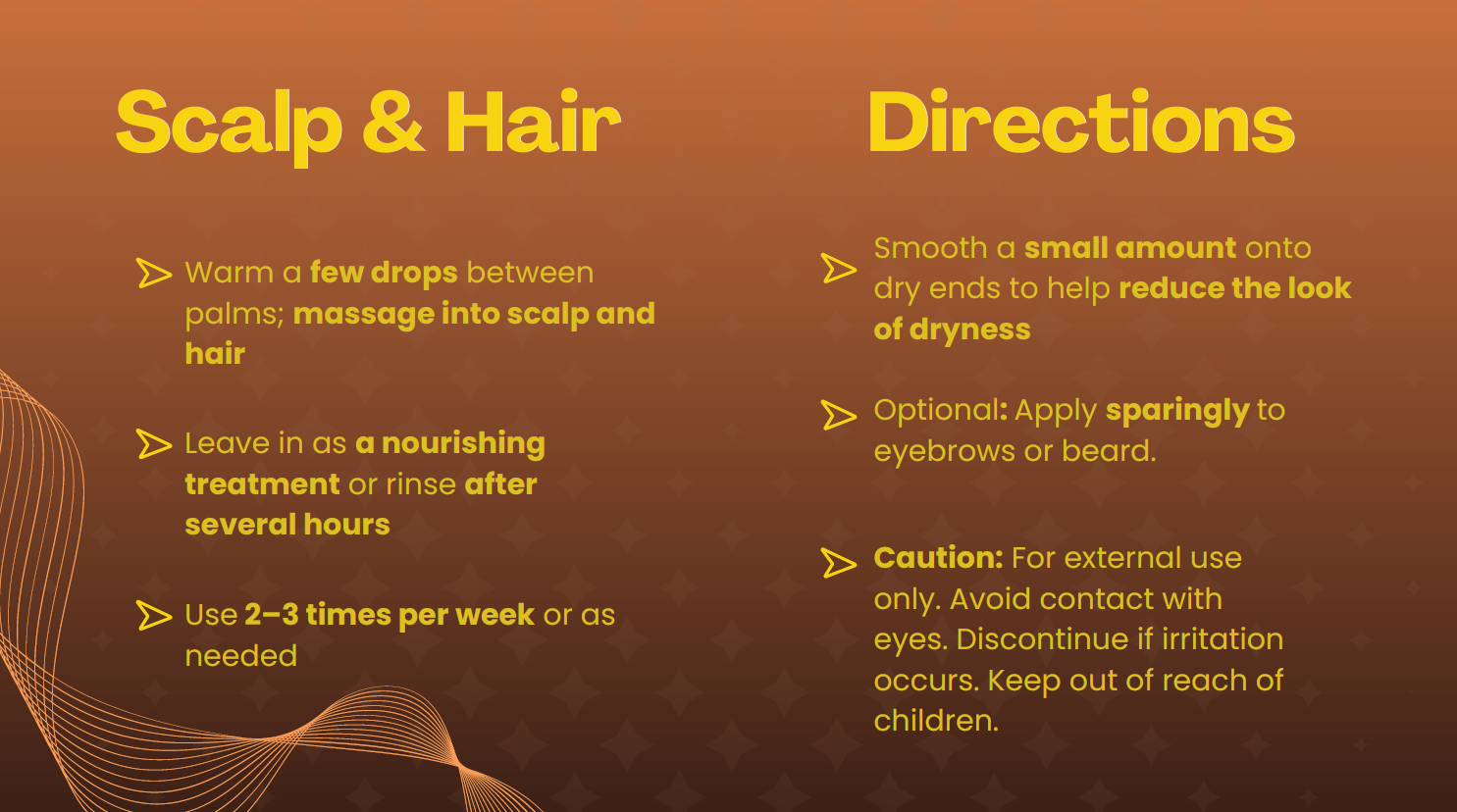 For scalp & hair: Warm a few drops between your palms and massage into scalp and hair.